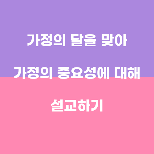 가정의 달을 맞아 우리는 가정의 중요성에 대해 설교해야 합니다. 가정은 우리 삶의 기초이자 가장 중요한 공동체입니다. 따라서 우리는 가정 내 소중한 인간관계를 강화하고, 서로를 이해하고 지지하는 중요성을 되새겨야 합니다. 부모는 자녀를 사랑하고 가르치며, 자녀는 부모를 공경하고 순종해야 합니다. 또한, 가정은 서로를 이해하고 존중하는 공간이어야 합니다. 가정은 각 구성원이 서로를 받아들이고 이해하며, 서로를 위해 봉사하는 공동체여야 합니다.