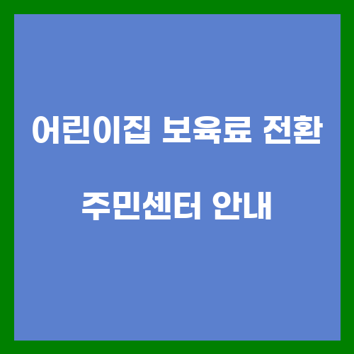어린이집 보육료 전환은 부모님들에게 중요한 문제일 수 있습니다. 어린이집 보육료 전환을 위해서는 주민센터를 방문하여 신청을 진행해야 하며, 주민센터에서는 보육료 전환과 관련된 모든 절차와 정보를 안내해 드립니다. 따라서 어린이집 보육료 전환에 대해 궁금한 사항이나 불편한 점이 있을 경우 주민센터를 찾아 상담을 받아보시기 바랍니다.